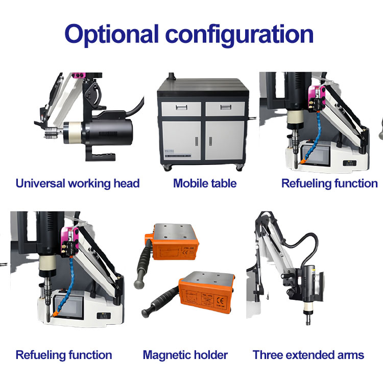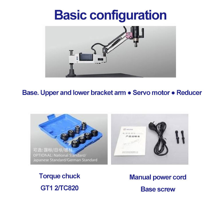సర్వో ఎలక్ట్రిక్ ట్యాపింగ్ మెషిన్ మెయిన్ కాన్ఫిగరేషన్: సర్వో మోటార్ (ఓకెర్స్), సర్వో డ్రైవ్ సిస్టమ్, హై-డెఫినిషన్ హ్యూమన్-మెషిన్ ఇంటర్ఫేస్, ప్రెసిషన్ ప్లానెటరీ రిడ్యూసర్, హై ప్రెసిషన్ బేరింగ్ బ్రాకెట్, హై స్ట్రెంత్ ఫిక్స్డ్ సీట్, సేఫ్టీ టార్క్ ప్రొటెక్షన్ చక్, ఎలక్ట్రిక్ బాక్స్, ఒక ప్రత్యేక రెంచ్, పవర్ లైన్