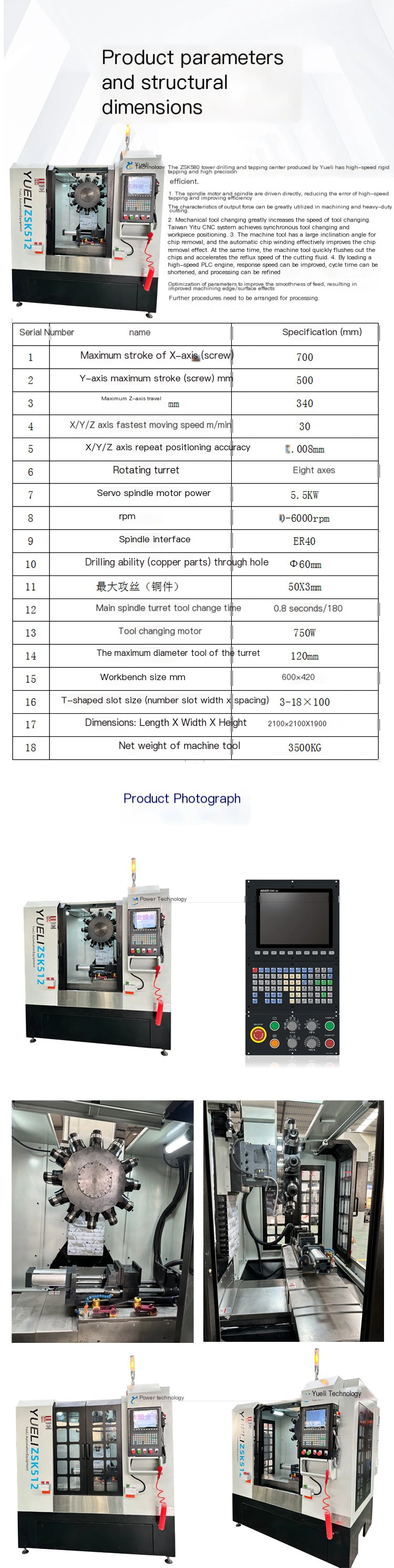 యులీ టరెట్ డ్రిల్లింగ్ మరియు ట్యాపింగ్ సెంటర్ ZSK580 ను హై-స్పీడ్ దృ tap మైన ట్యాపింగ్, అధిక ఖచ్చితత్వం మరియు అధిక సామర్థ్యంతో ఉత్పత్తి చేస్తుంది.